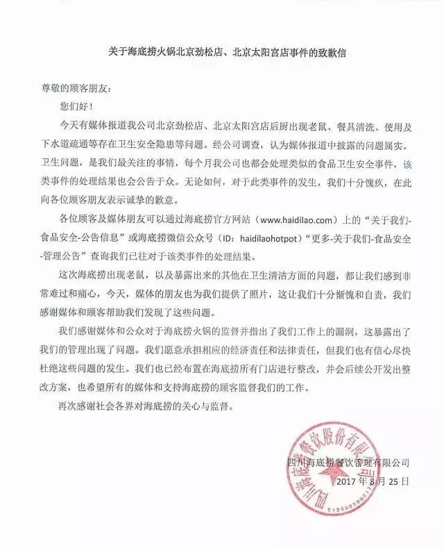 公关派的代表是海底捞。 今年8月,媒体曝光海底捞北京两家门店出现老鼠,使用餐具疏通下水道,海底捞在几个小时内就发布了道歉声明,赢得一片叫好,被誉为“危机公关的经典案例”,“危机道歉信的标准版本”。