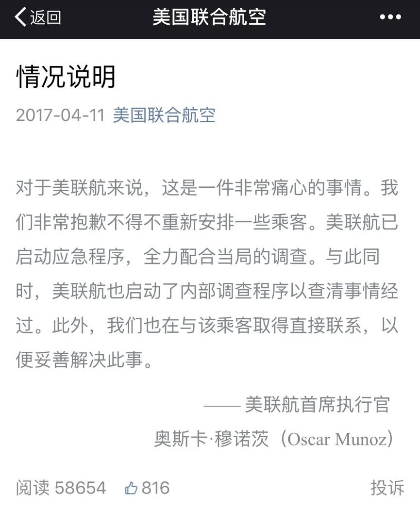 看看美联航的第一篇声明: