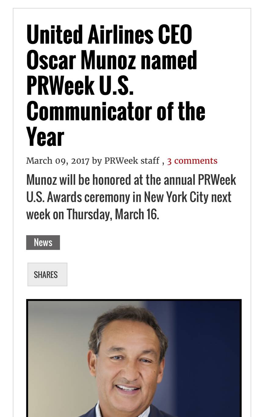 你可以说CEO不懂公关,可是美联航的CEO奥斯卡·穆诺兹刚刚在上月获得美国最有影响力的公关媒体PR WEEK颁发的2017“年度传播人物”大奖。