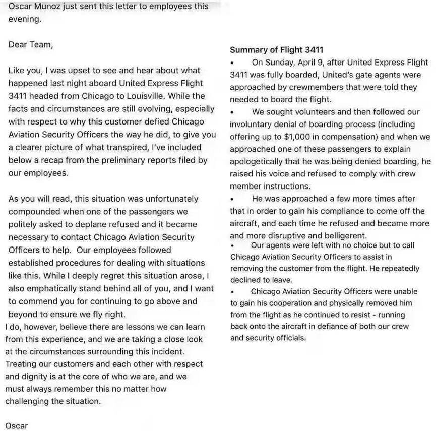 在这次飞行中发生的可怕事件引起了许多回应:愤慨,愤怒,失望。我理解这些情绪,并致以深切的道歉。像你们一样,我对这次飞行发生的事情感到不安,我对被拖拽的客户及其他机上的乘客表示深切的歉意。没有人应该这样被虐待。