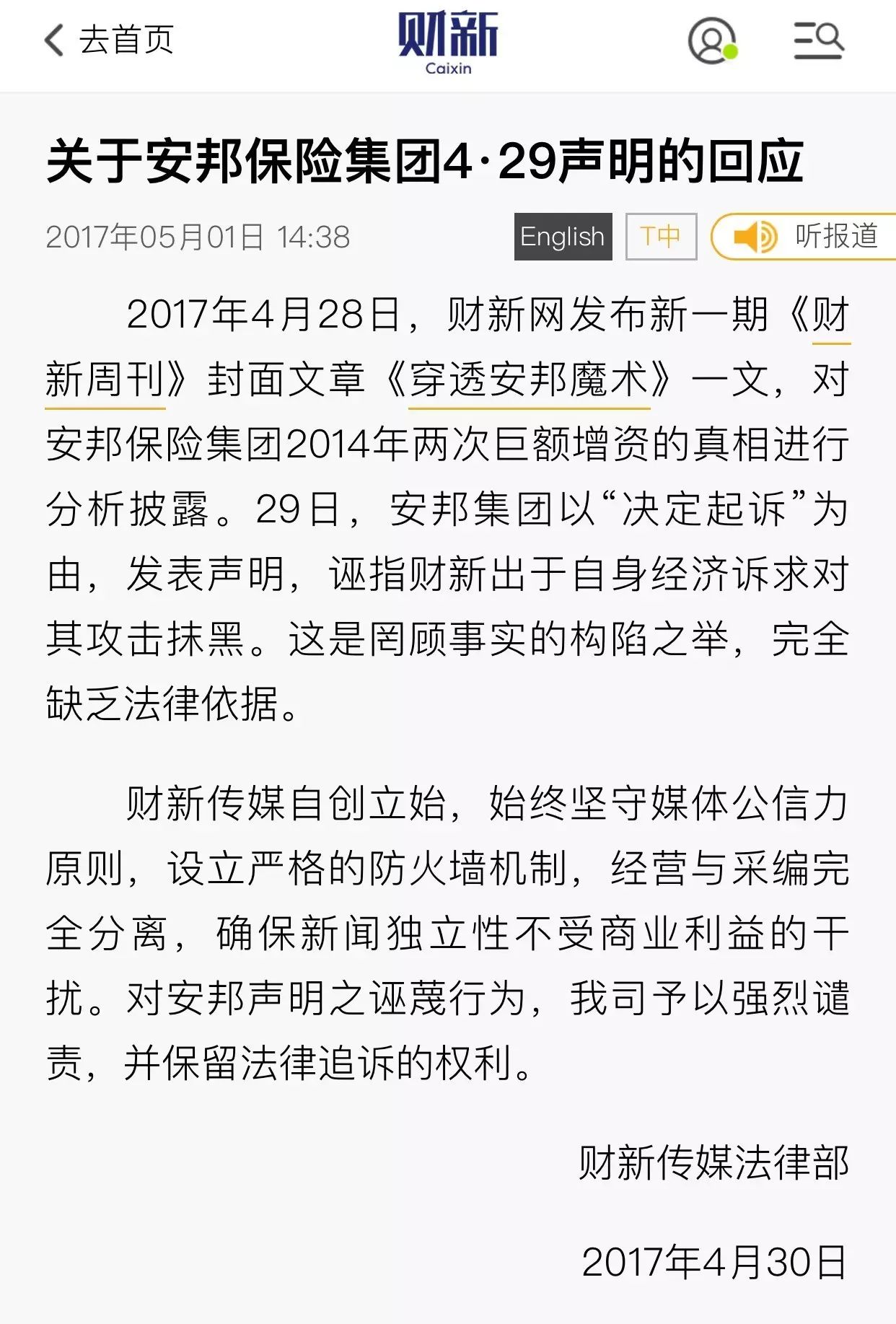 30日,财新传媒发表“关于安邦保险集团4.29声明的回应”,称安邦“诬指财新出于自身经济诉求对其攻击抹黑。这是罔顾事实的构陷之举,完全缺乏法律依据。“