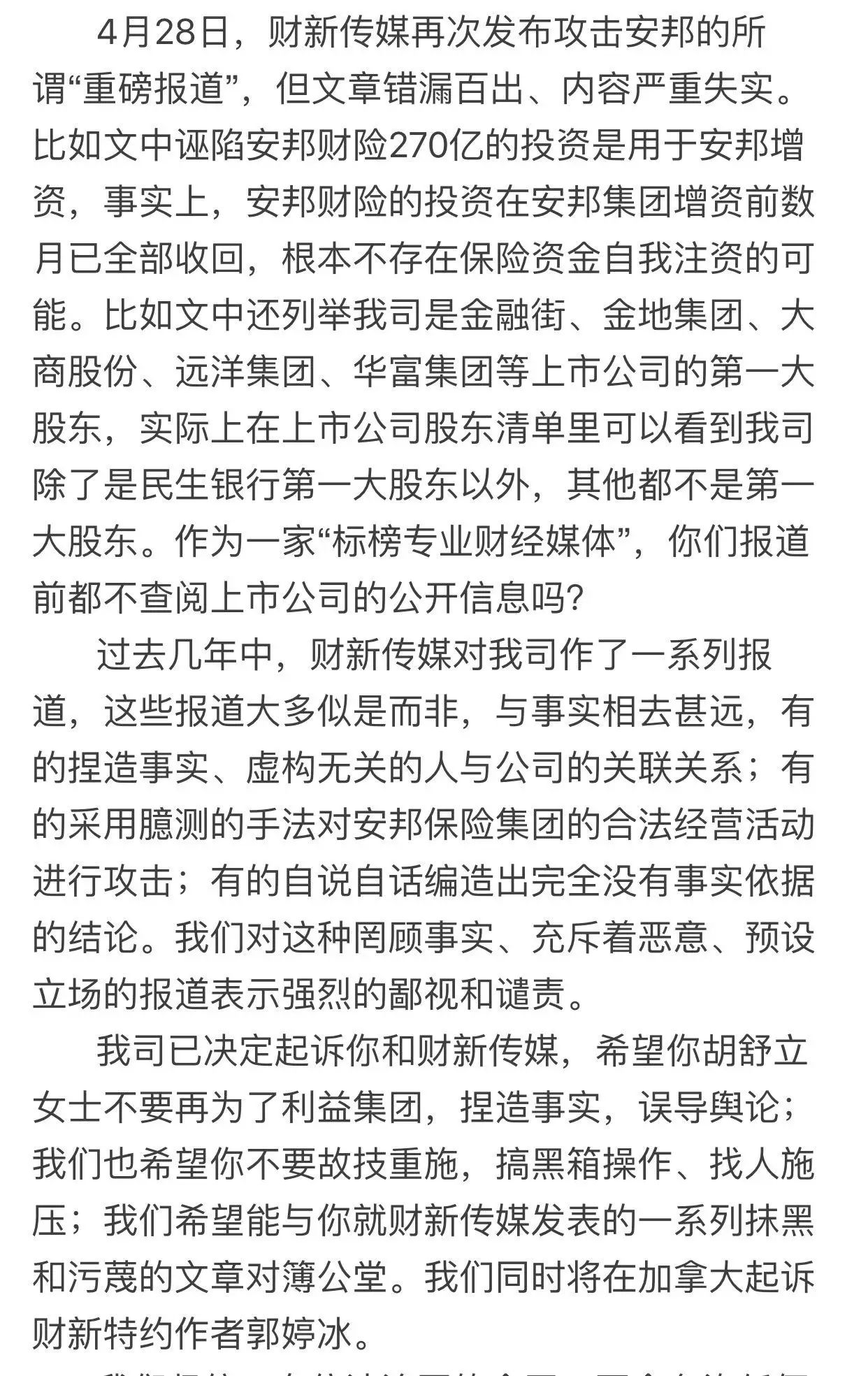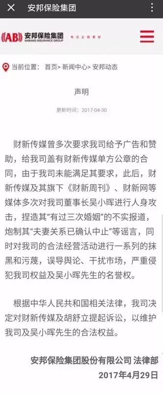29日,安邦在官网发表声明,“决定对财新传媒及胡舒立提起诉讼,以维护我司及吴小晖先生的合法权益”。