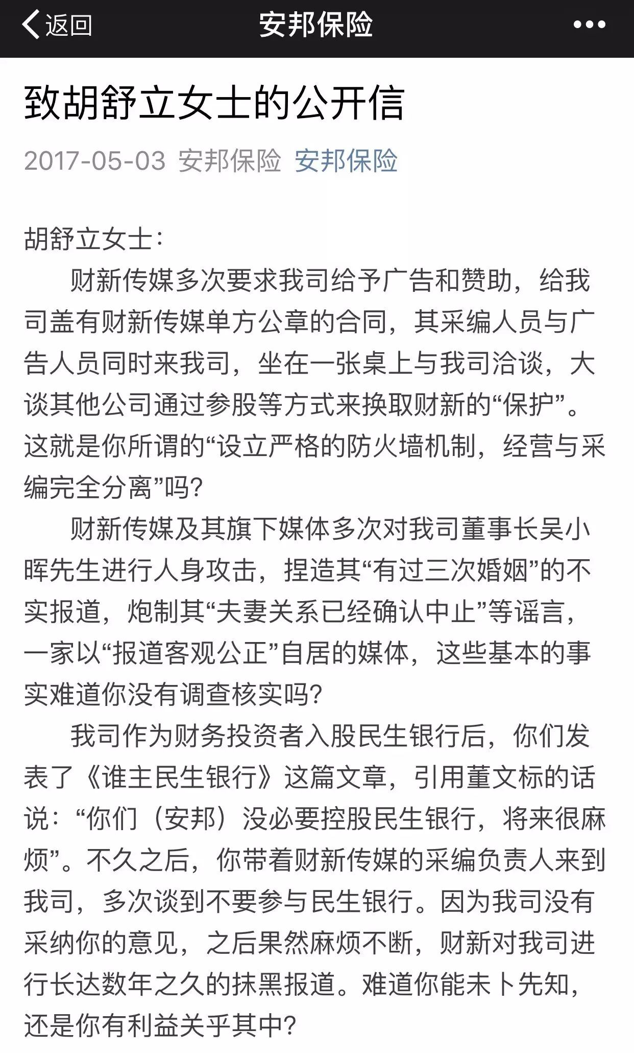 5月3日,安邦保险集团又发布“致胡舒立女士的公开信”,开头就直称“财新传媒多次要求我司给予广告和赞助,给我司盖有财新传媒单方公章的合同,其采编人员与广告人员同时来我司,坐在一张桌子上与我司洽谈,大谈其他公司通过参股等方式来换取财新的‘保护’“,以及财新”多次对我司董事长吴小晖先生进行人身攻击,捏造其‘有过三次婚姻’的不实报道。