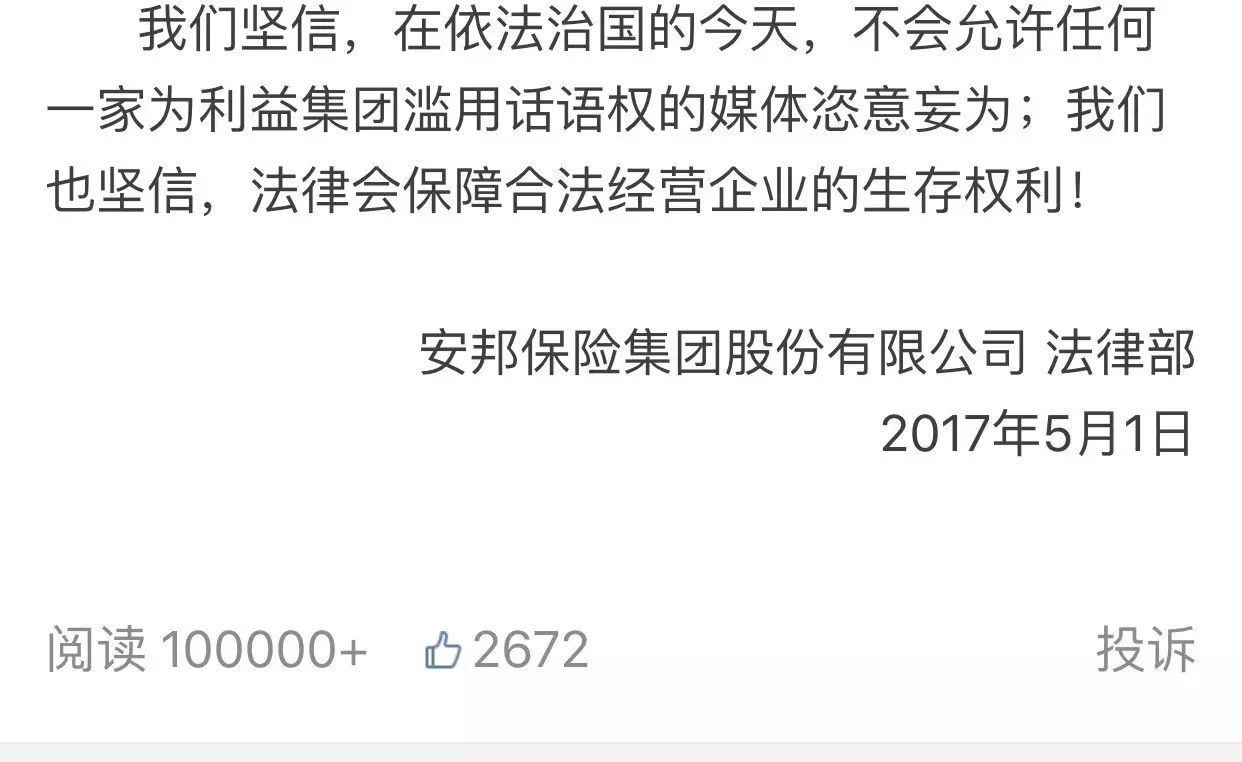 而在安邦声明中,几乎看不到法律部的影子,其激扬奋发,洋洋洒洒,彰显了公关部的强大,每个做公关的人,都羡慕能有这样的表达,回忆在各种危机公关中被法律部打压的情景。