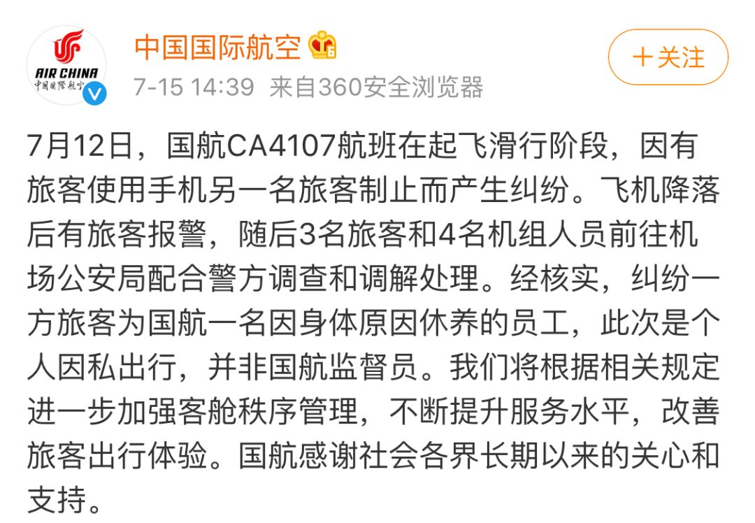 针对网上沸沸扬扬的议论,国航15日发了一份官方声明,对一名自称“监督员”的国航休病假员工与公务舱乘客的纠纷一事试图画上句号。