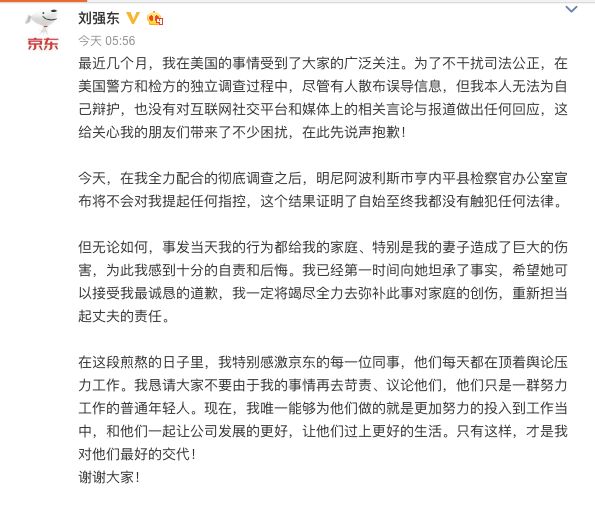 刘强东在他的社交媒体上发布了道歉信: