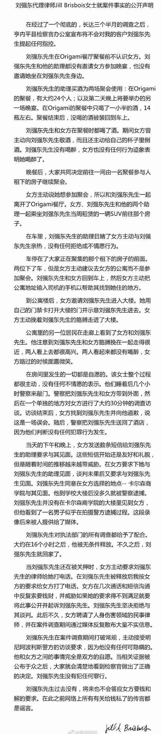 刘强东律师给媒体的声明