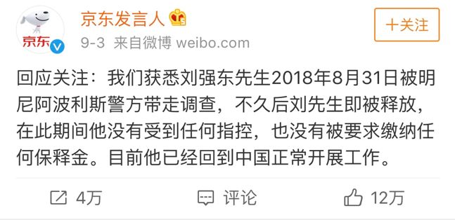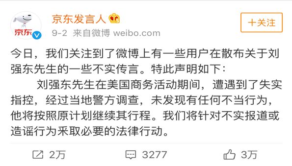 一个超简洁的声明。 在常规声明的四个要素:事实、态度、原因、措施中,这里只有事实、态度、措施,如果讲原因,可以说,“刘强东先生根本就没有任何违法行为”,但是要避免声明引发更多对公司不利的议论。