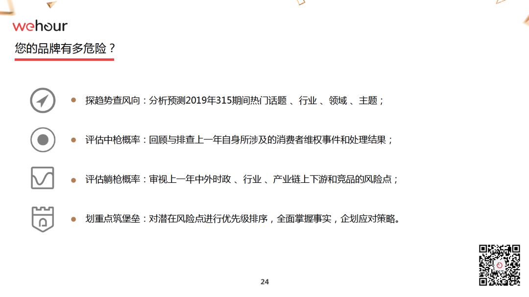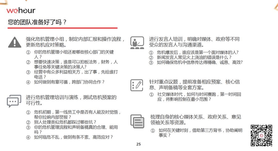 《315备战红皮书》下篇会收取一些费用,另外,我本人——姐夫李,还有Wehour创始人,前安可顾问中国总经理杜凌,资深公关人,优客工厂外部合伙人,前优步、亚马逊、戴尔等公司高管高超,也会提供针对企业的危机公关内训、模拟演练等较高收费的服务,详情请点击下面Wehour公司二维码。