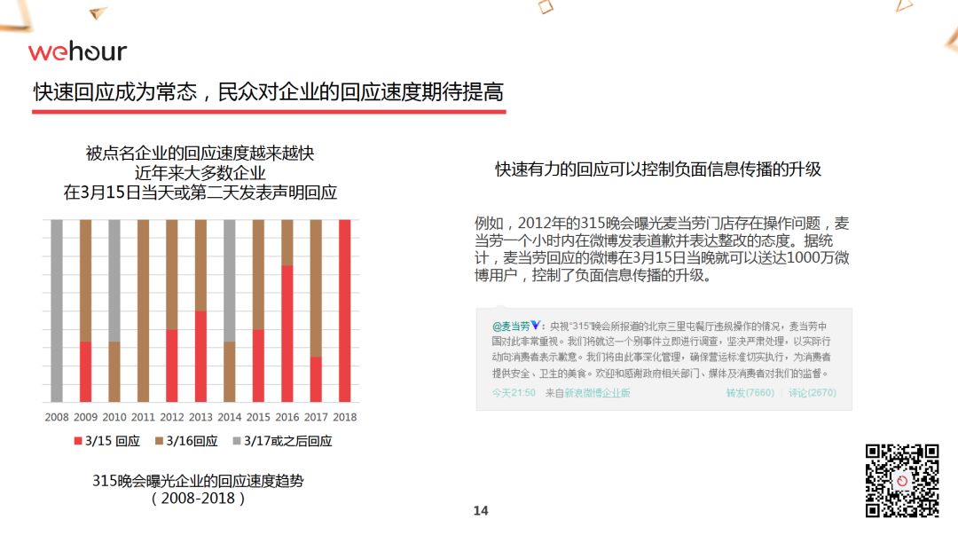 报告里你会关注一些事实,比如,2008年,所有在央视315晚会被点名的企业都是3月17日以后才回应的,而到了2018年,所有被点名的企业都在315当天向公众作出了回应。