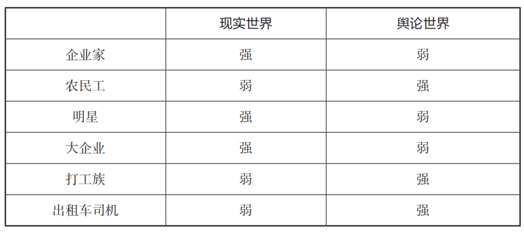 比如,亿万富翁,在现实社会是强者,在舆论世界是弱者,这里讲的舆论世界的弱势,不是一个群体在舆论场现有的声量,甚至不是现有的美誉度,而是他在完成与自己身份相冲突的行动之后所能做出的自我辩护的力量。