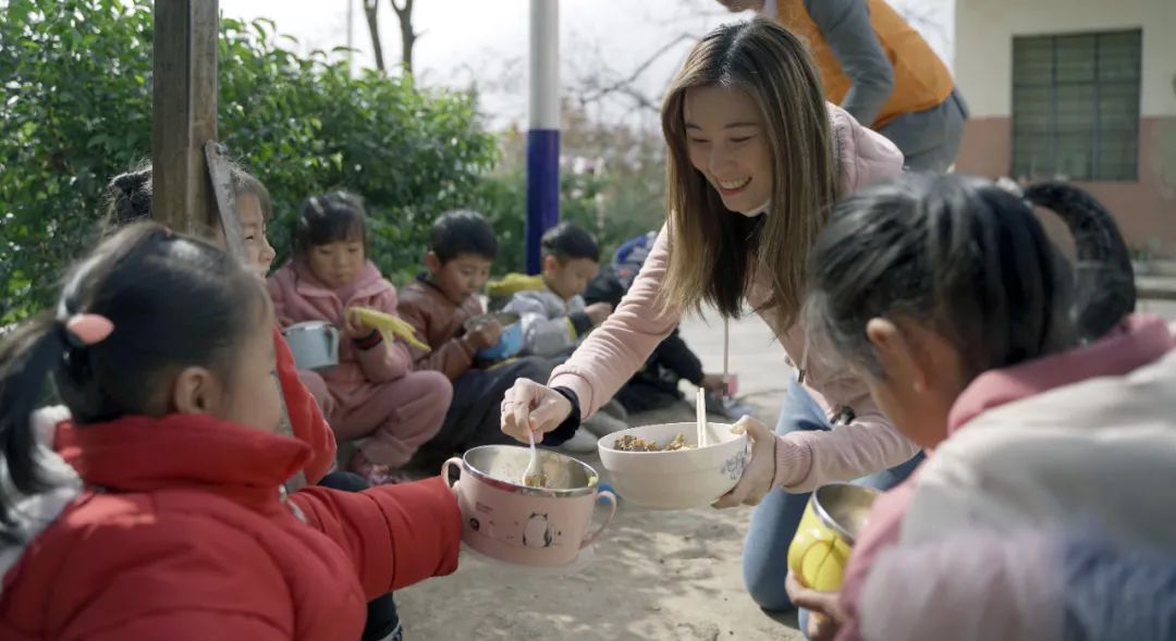 “养苗计划”助力乡村儿童营养健康发展,叶莉思和当地孩子体验分享着美味的营养午餐。