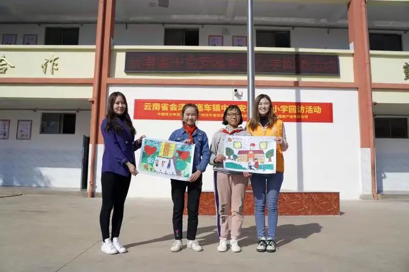 云南省会泽县迤车镇中食安泓希望小学落成,孩子们向叶莉思赠画(右一)