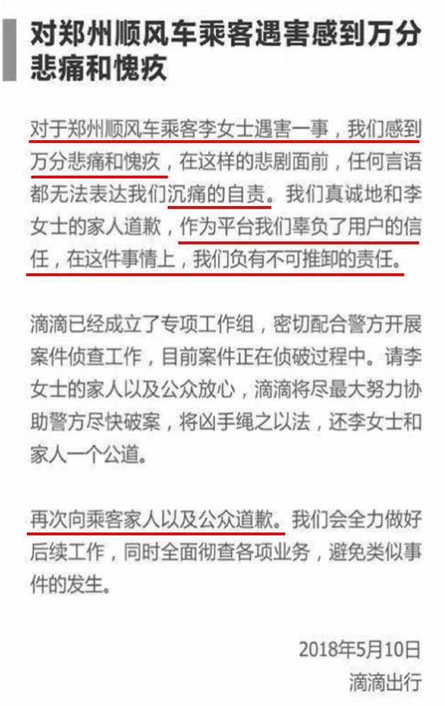 我们可以对比一下,滴滴在5月10日发表的关于郑州空姐遇害事件的声明(此声明后来被发布方删除):