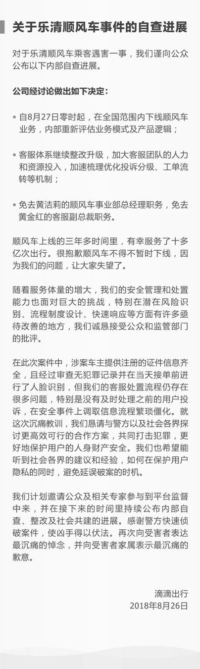 8月26日周日上午滴滴发出第二次声明,对第一次声明没有说明的问题做了进一步解释,包括顺风车业务全国下线,相应责任人被免职等措施,承认“在安全事件上调取信息流程繁琐僵化”。