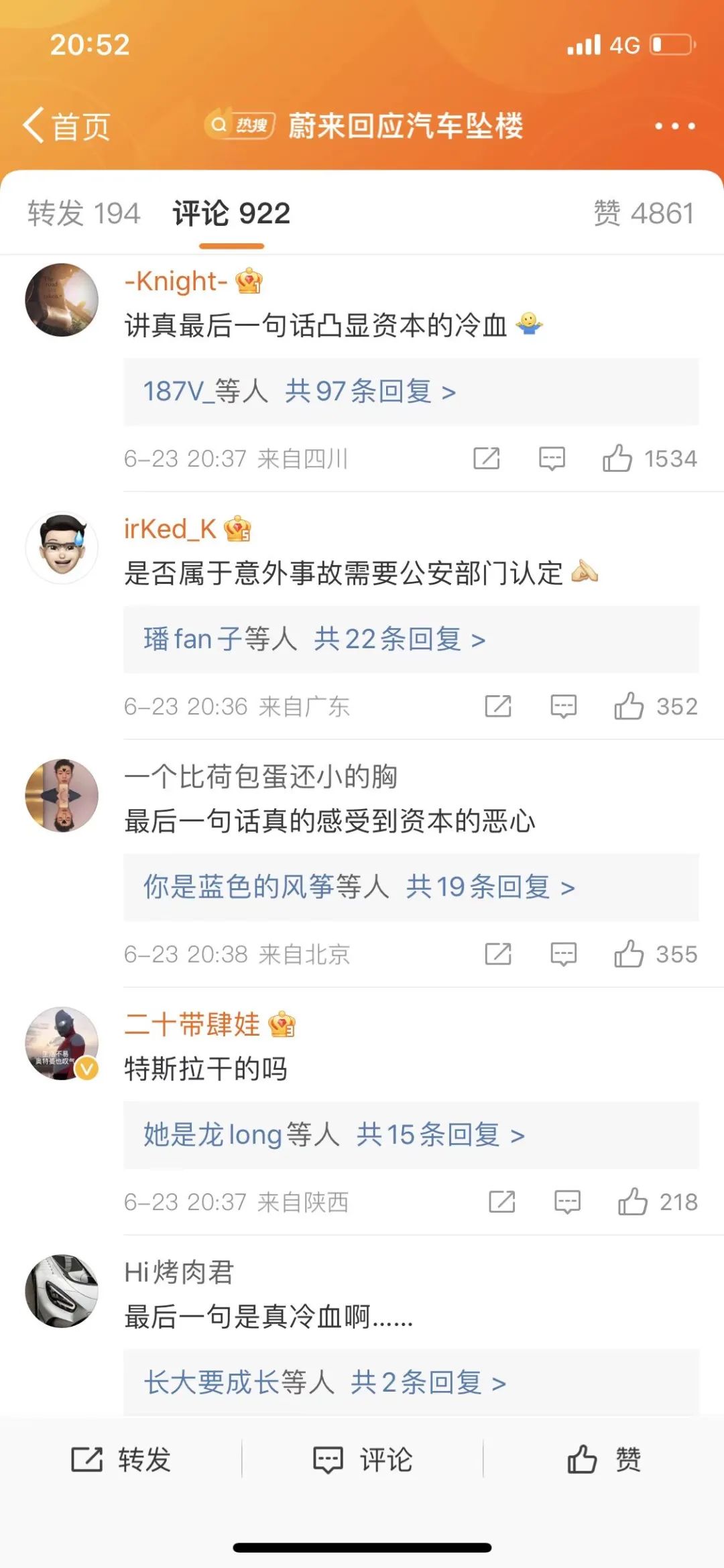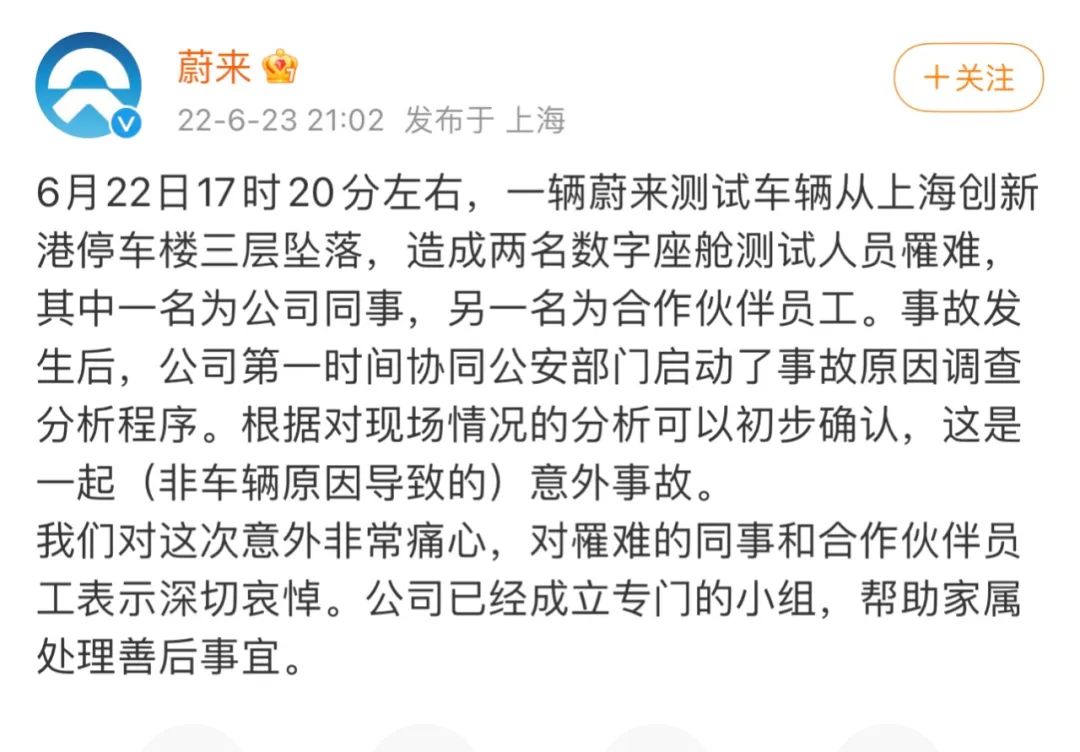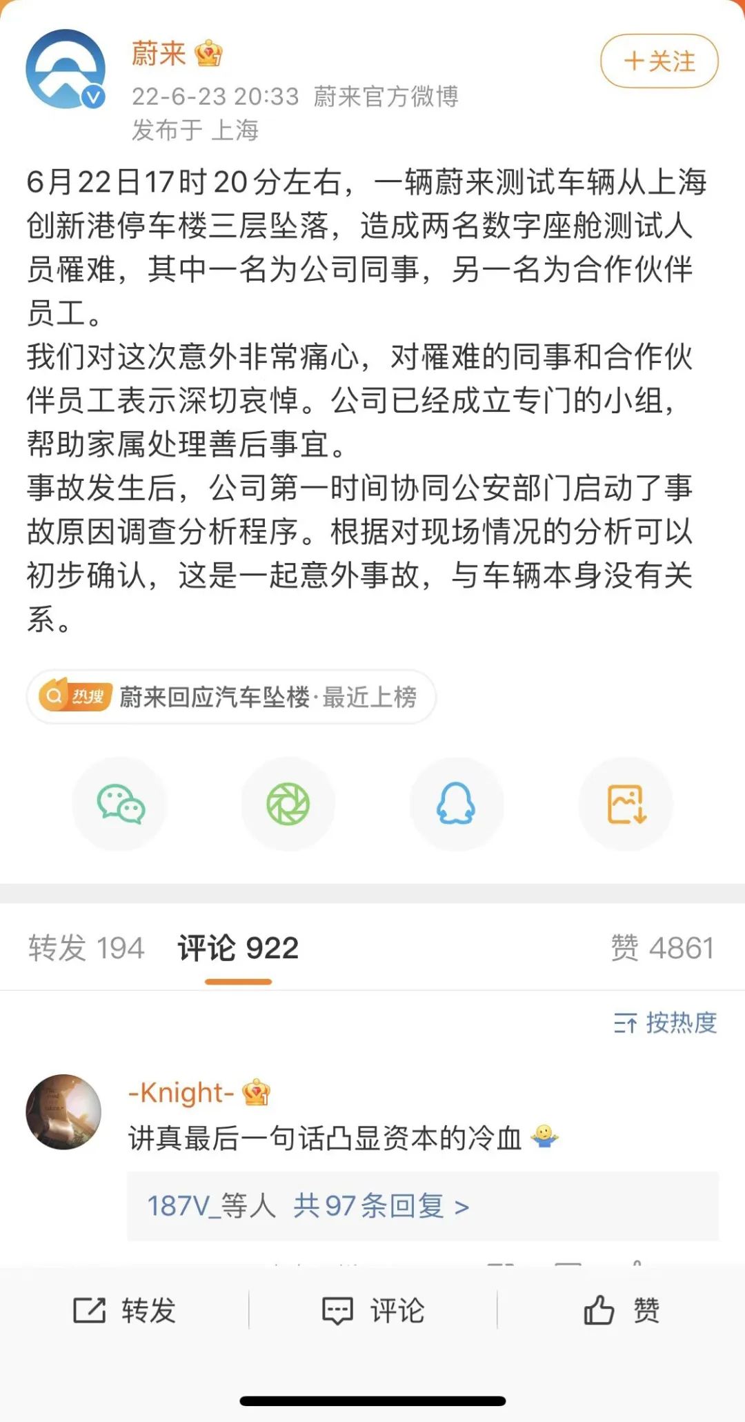 蔚来第一次声明强调“与车辆本身没有关系”,删后再发,称“非车辆原因导致”,被网友指“冷血”。